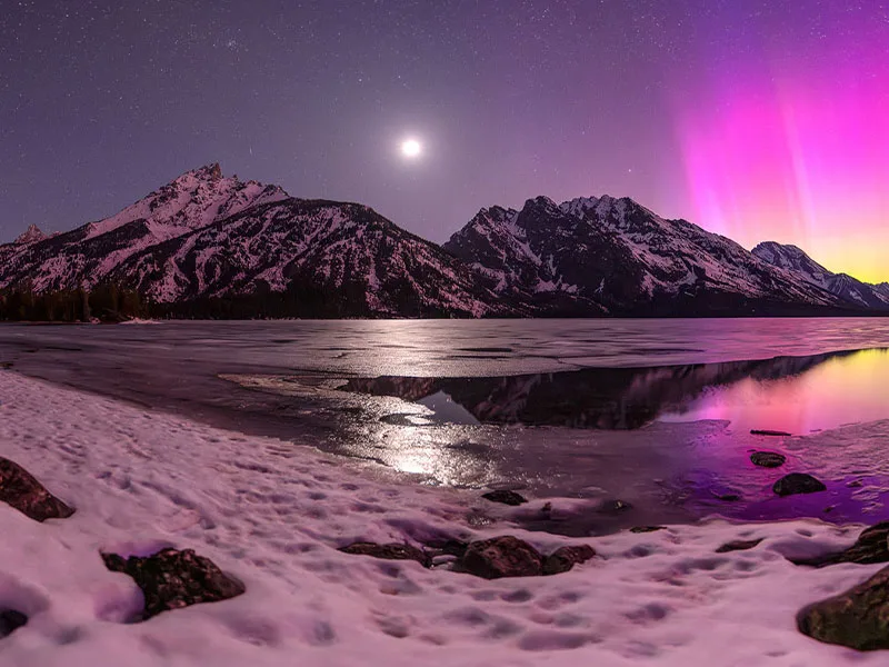 Rising sharply from the valley floor, Grand Teton National Park is defined by its towering peaks, mirror-like lakes, and vast meadows that come alive each summer with wildflowers. Snowmelt from the Teton Range feeds winding rivers and quiet ponds that perfectly reflect the mountain skyline. At night, moonlight sweeps across the jagged range, illuminating snowfields, forests, and alpine meadows in soft silver light. On rare occasions, the aurora borealis may flicker on the northern horizon, adding another layer of magic to these already striking landscapes.